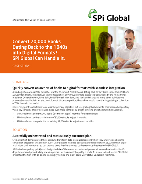 A leading international STM publisher wanted to convert 70,000 books, dating back to the 1840s, into eBook, POD, and MyCopy renditions. The goal was to give researchers anytime, anywhere access to publications by the finest minds in science (Albert Einstein, Niels Bohr, Rudolf Dielsel, Max Born, and Karl von Frisch) and many other publications previously unavailable in an electronic format. Upon completion, the archive would have the largest single collection of STM books in the world