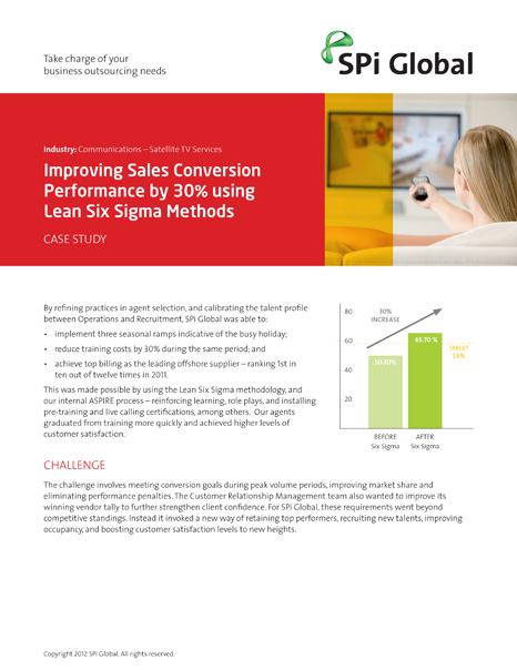 CHALLENGE: The challenge involves meeting conversion goals during peak volume periods, improving market share and eliminating performance penalties. The Customer Relationship Management team also wanted to improve its winning vendor tally to further strengthen client confidence. For SPi Global, these requirements went beyond competitive standings. Instead it invoked a new way of retaining top performers, recruiting new talents, improving occupancy, and boosting customer satisfaction levels to new heights.e by using Lean Six Sigma Methods.
